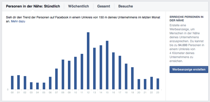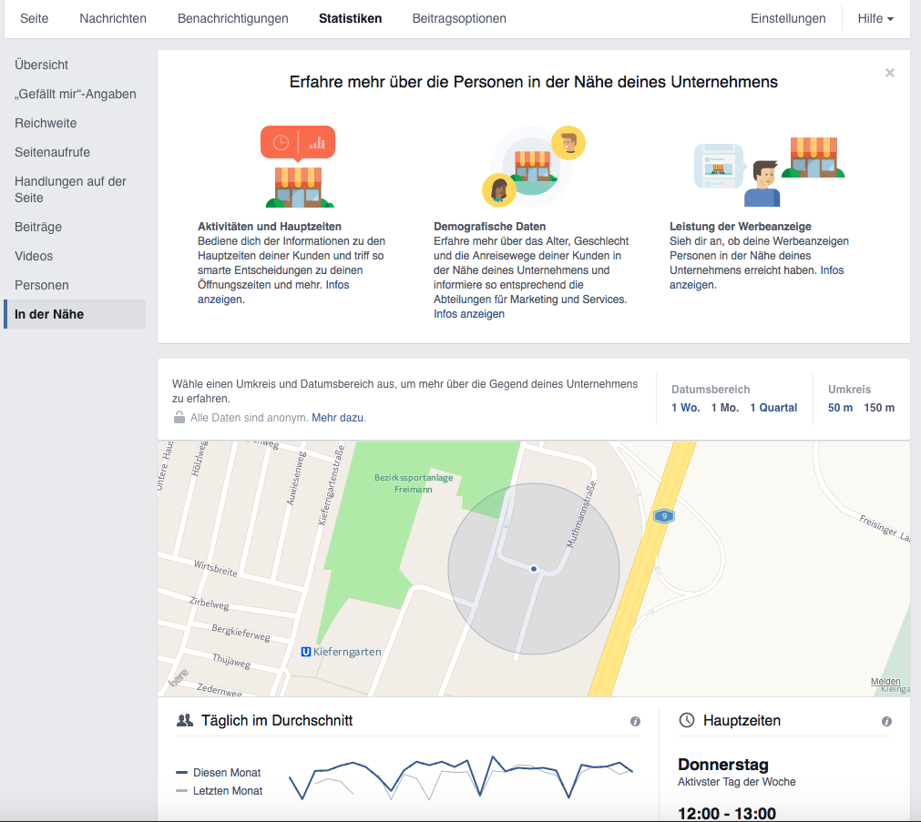 Bei einigen Administratoren von lokalen Facebookseiten (Orten) erscheint neuerdings der Abschnitt „in der Nähe“ in den Seitenstatistiken. Die Informationen, die dort aufgeführt werden beziehen sich auf Facebooknutzer, die sich in der Nähe der physischen Adresse des Unternehmens aufhalten. Die Daten sind anonymisiert und werden nur von Nutzern erfasst, die „Location Services“ auf Ihrer Facebook Smartphone App aktiviert haben. Außerdem gibt es hier keine absoluten Zahlen zu Nutzern in der Nähe des Standorts, sondern nur relative Werte bzw. „Trends“.