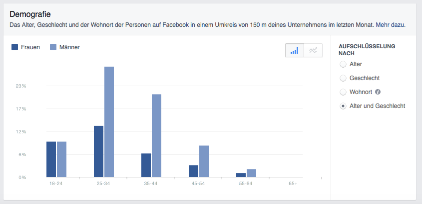 - „Demografie“: Wie ist die Verteilung von Alter und Geschlecht, bei den Nutzern, die sich im Umkreis meines Standortes aufhalten?