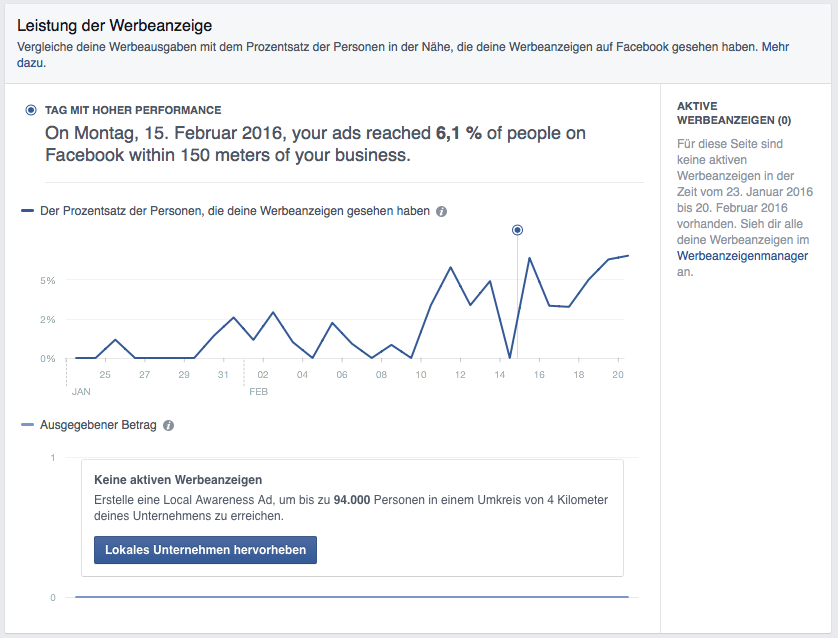 - „Leistung der Werbeanzeige“: Welchen Anteil der Facebooknutzer im Umkreis meines Standortes habe ich mit bezahlten Facebook Anzeigen an welchem Tag erreicht?